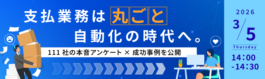 | 概要 | 支払業務は“丸ごと”自動化の時代へ。111社の本音アンケート×成功事例を公開「受領はデジタル化したが、結局手入力やチェック作業が残っている」 「システムが分断されており、振込データ作成までに複数の工程が発生している」 今、経理部門が目指すべきは、点在するツールの導入ではなく、プロセス全体を一本の線でつなぐ「支払業務の完全自動化」です。しかし、いざシステム刷新を検討すると、「自社に合うのか」「費用対効果は出るのか」といった不安から、踏み切れないケースも少なくありません。 本セミナーでは、実際にシステム刷新を行った111社への実態調査を公開。 「刷新前に感じていた不安」から「導入後の満足度」、そして「もっと早くやればよかった」と回答した企業のリアルな本音まで、他社が語る“刷新の真実”を紐解きます。 刷新を「単なる入れ替え」で終わらせず、支払業務の“丸ごと”自動化を実現し、経理を「分析」へとシフトさせるための成功方程式を他社の成功事例を交えて提示します。 こんな方におすすめです