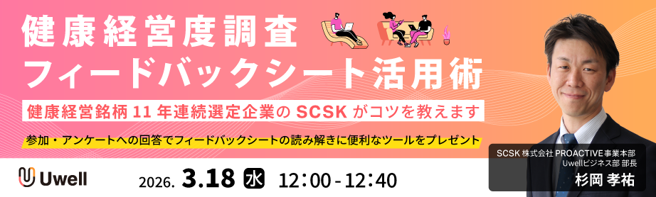| 概要 | 健康経営度調査フィードバックシート、正しく活用できていますか? 登壇者:SCSK株式会社 PROACTIVE事業本部 Uwellビジネス部 部長 杉岡 孝祐 |