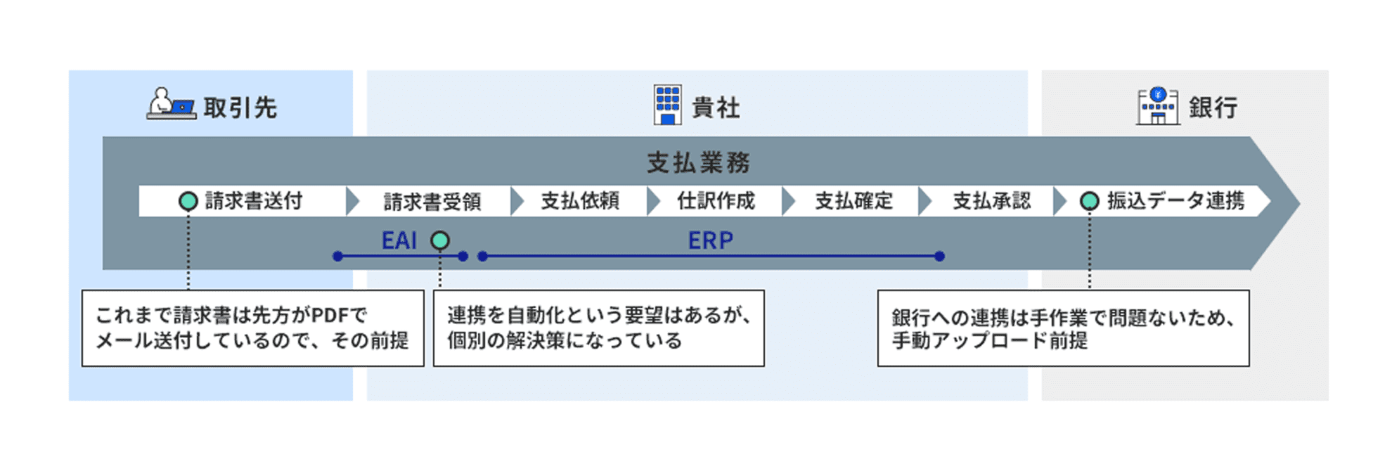顧客からの請求書受領、立替経費の領収書受領から銀行への振込データ連携までを業務完結でシステムで一気通貫に対応を可能にした支払業務のベストプラクティスモデル。 |