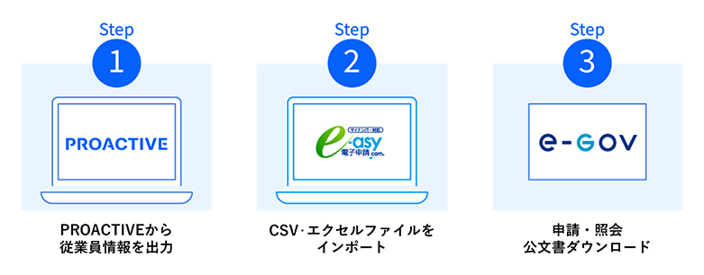 PROACTIVEで出力した従業員情報(ExcelやCSVデータ)を、「e-asy電子申請.com」に取り込むだけで、e-Govに直接アクセスしなくても申請が可能。