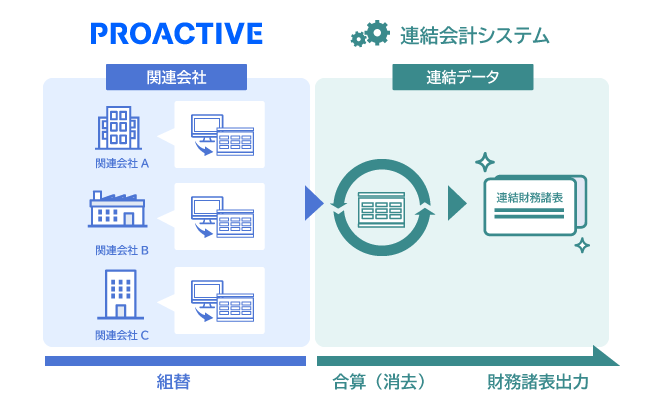 グループ経営が重視される昨今において、連結会計のシステムは欠かせません。PROACTIVEでは、連結会計システム側の取込ファイルレイアウトに合わせてデータを変換するだけでなく、連結会計用の科目やコード体系に個社の科目やコードを変換し、出力する連携インターフェース機能を備えています。なお、連結対象社数などにより、最適な連結会計システムを提案させていただきます。