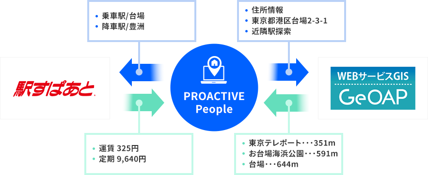 従業員によるPROACTIVE経費管理システムの出張・交通費精算時、経路検索システムと連携することで、利用区間・交通費などの登録負荷を軽減できます。またPROACTIVE人事・給与システムにおける通勤経路・通勤費申請においても、地図情報から自宅の最寄り駅候補の表示・自動入力、通勤定期券費用の入力負荷を軽減します。