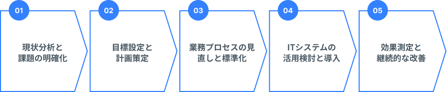 設定した目標を達成するために、既存の業務プロセスを抜本的に見直します。不要な作業の廃止、重複作業の統合、作業手順の簡素化などを検討します。また、属人化を排除し、誰でも一定の品質で業務を遂行できるように、業務マニュアルの作成や作業手順の標準化を進めます。この際、単に既存のやり方を整理するだけでなく、あるべき姿を定義し、それに向けてプロセスを再構築する視点が求められます。