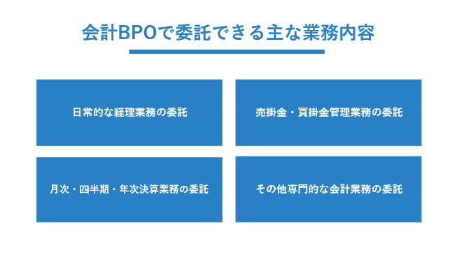 会計BPOサービスでは、企業の経理・会計に関する多岐にわたる業務を委託することが可能です。ここでは、代表的な委託可能業務を紹介します。