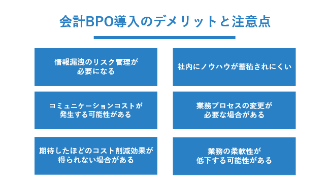 多くのメリットがある会計BPOですが、導入にあたってはいくつかのデメリットや注意点も理解しておく必要があります。