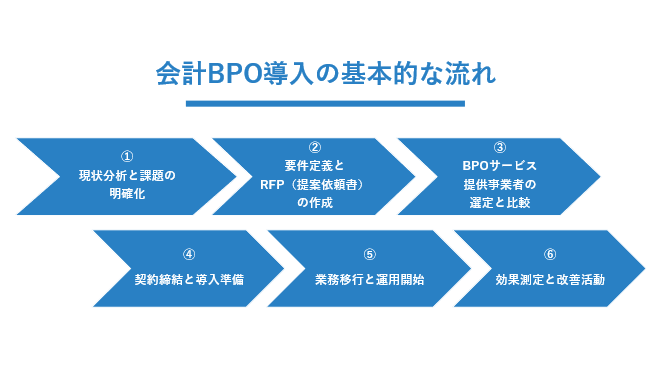 会計BPOを導入する際には、計画的に進めることが成功のポイントです。一般的な導入ステップを紹介します。