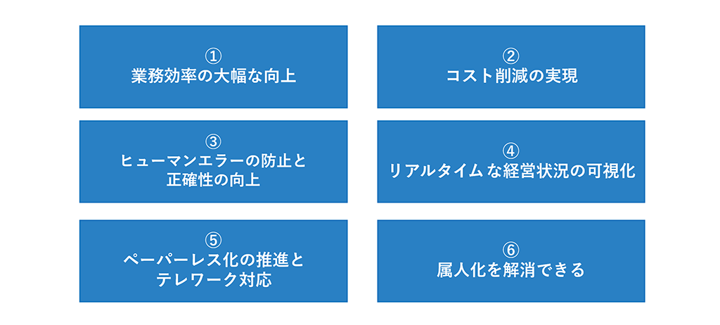 | ヒューマンエラーの防止と正確性向上 | 入力ミス・計算ミス削減、データ品質向上、コンプライアンス強化 |