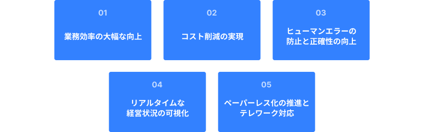 業務効率の大幅な向上 | 定型業務の自動化、月次決算の早期化、残業時間の削減 |