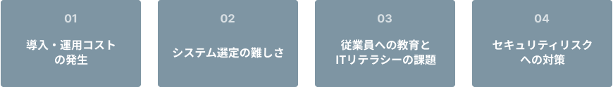 新しいシステムや業務プロセスを導入する際には、従業員がそれらをスムーズに使いこなせるようにするための教育やトレーニングが不可欠です。しかし、従業員の中には、新しいツールの操作に抵抗を感じたり、ITリテラシーに不安を抱えていたりする人もいるかもしれません。 このような状況を放置すると、せっかく導入したシステムが十分に活用されず、DXの効果が半減してしまう可能性があります。そのため、導入計画の段階から従業員への丁寧な説明と研修プログラムの準備を進め、変化に対する不安を取り除き、積極的に新しいシステムを活用してもらえるような環境づくりを心掛ける必要があります。
