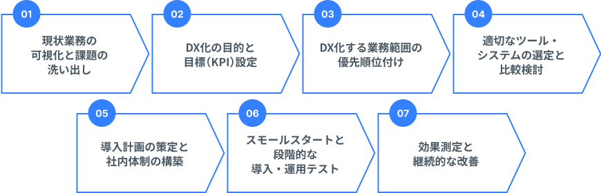経理DXを成功させるためには、計画的かつ段階的に進めていくことが重要です。ここでは、経理DXを推進するための具体的な7つのステップを紹介します。これらのステップを参考に、自社の状況に合わせて進め方を検討してみてください。
