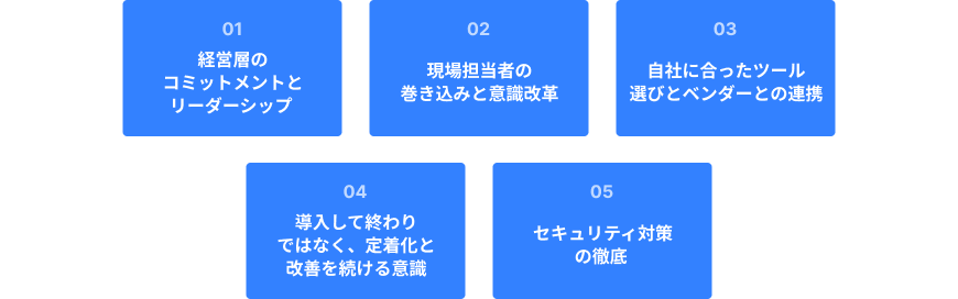 経理DXは、単に新しいシステムを導入するだけでは成功しません。組織全体で取り組み、継続的に改善していく意識が重要です。ここでは、経理DXを成功に導くための重要なポイントを5つ紹介します。