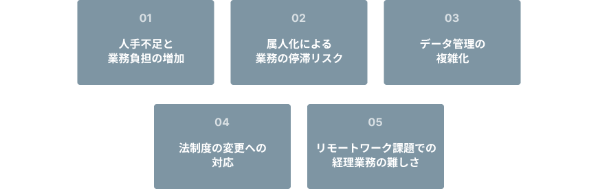 現代の企業が抱える経理業務の課題について、以下の5つの観点から解説します。