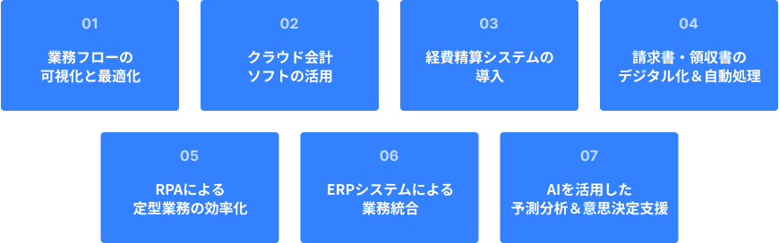 経理業務の効率化を実現するための具体的な方法として、以下の7つのアプローチを解説します。企業の規模やニーズに合わせて、最適な方法を選択することが重要です。