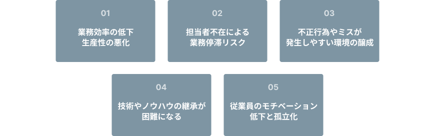スキルアップ機会の損失 | 他の従業員が業務を経験できず、スキルアップの機会が失われる。 |