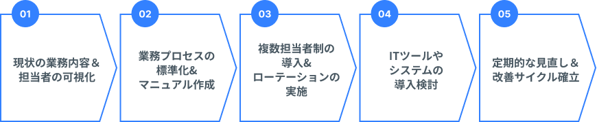 この棚卸しを通じて、形骸化しているルールや非効率な作業がないかを確認し、必要に応じてマニュアルの更新や業務フローの改善を行います。これにより、知らず知らずのうちに特定の担当者に業務が偏ってしまうことを防ぎます。