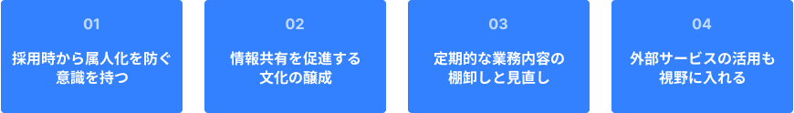 属人化を解消することも重要ですが、同時に、将来的に新たな属人化が発生しないように予防策を講じることも大切です。継続的な取り組みによって、属人化しにくい組織体制を構築しましょう。