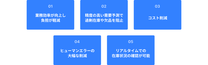 在庫管理にAIを導入することで、企業はさまざまなメリットを享受できます。特に業務効率の向上や過剰在庫・欠品の減少による収益性の改善は、多くの企業にとって魅力的なポイントです。