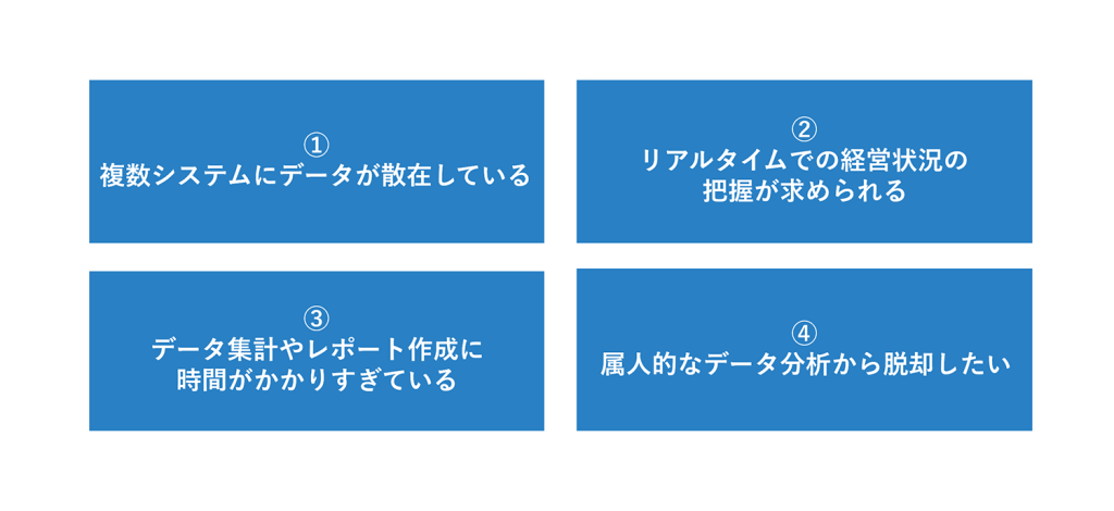 多くの企業では、販売管理システム、顧客管理システム(CRM)、会計システムなどが部門ごとに分断され、データが各所に散在しています。このような環境では、情報を横断的に把握しようとすると、システムごとにデータを抽出・加工する必要があり、迅速な意思決定の妨げとなります。
