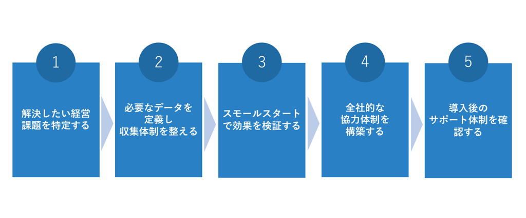 BIツールは強力な武器になり得ますが、導入を成功させるためには、計画的なアプローチが不可欠です。ここでは、BIツールの導入で失敗しないための具体的な5つのステップを紹介します。自社にとって最適な形でデータ活用を推進しましょう。