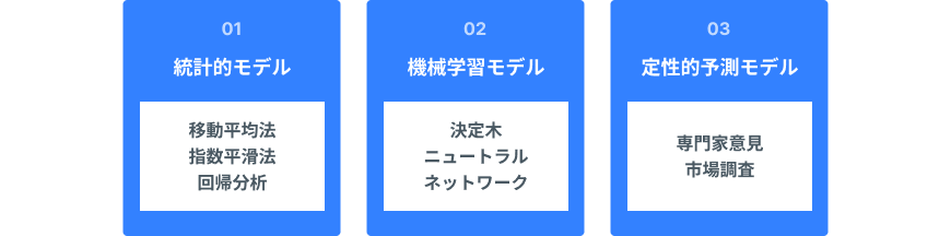 需要予測モデルには様々な種類があり、それぞれ特徴や適している状況が異なります。ここでは、大きく分けて「統計的モデル」「機械学習モデル」「定性的予測モデル」の3つのカテゴリーに分類して解説します。