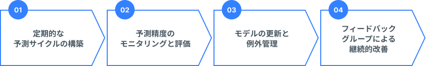 予測の実施頻度(日次・週次など)を業務に応じて設定し、予測結果の確認・承認・関連部門との共有体制を整えます。予測精度の安定運用に不可欠なステップです。