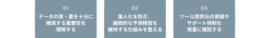 需要予測モデルの導入・運用において、失敗を避けるためにはいくつかの重要な注意点があります。ここでは、特に重要な3つのポイントについて詳しく解説します。