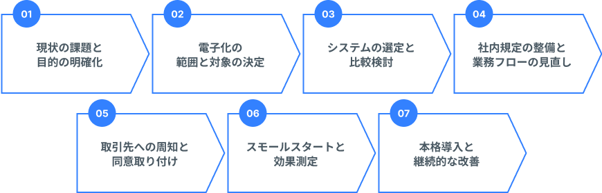 請求書電子化は、単にシステムを導入すれば完了というわけではありません。計画的にステップを踏んで進めることで、社内や取引先との混乱を避け、効果を最大限に引き出すことができます。
