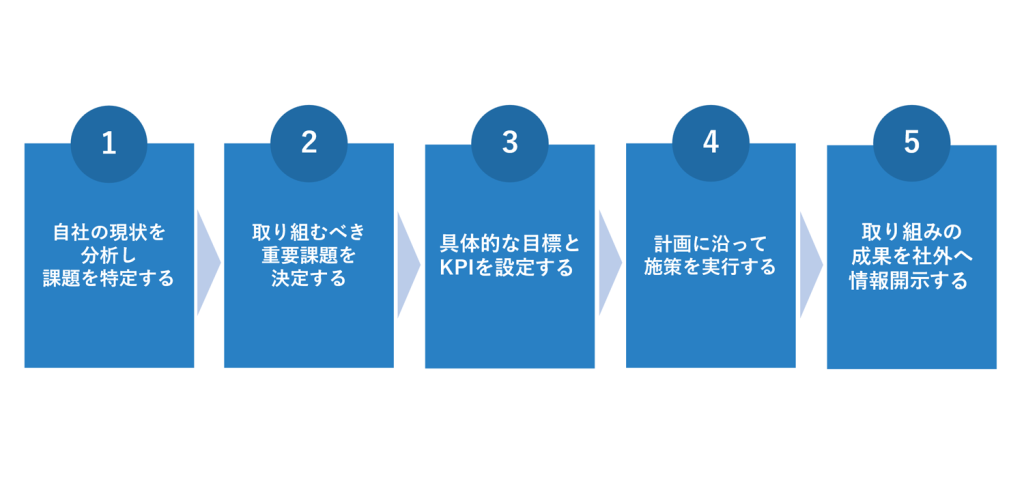 ESG経営を効果的に進めるためには、計画的かつ体系的に取り組むことが重要です。ここでは、これからESGの取り組みを始める企業が踏むべき基本的な5つの手順を解説します。