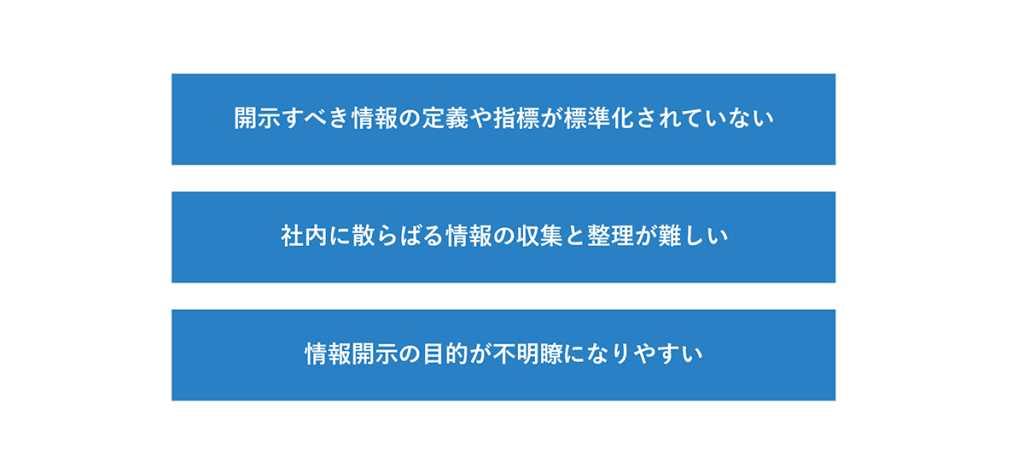非財務情報はカバーする範囲が広く、財務情報のように世界的に統一された明確な開示基準がまだ確立されていません。特に、ESG評価機関によって評価項目や重点が異なるため、どの情報に優先順位をつけて開示すべきか、企業側が判断に迷うケースが少なくありません。このことが、開示に向けた取り組みのハードルとなっています。