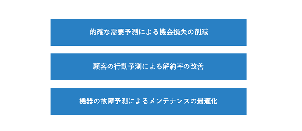 | 予測分析 | 過去のデータに基づき、「何が起こるか」を予測する | 来月の製品需要予測 顧客の離反可能性のスコアリング |