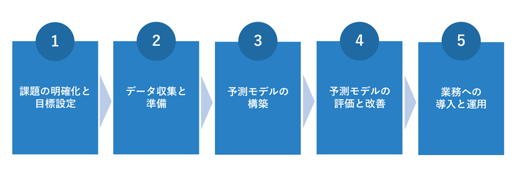 予測分析プロジェクトを成功に導くためには、計画的かつ段階的に進めることが重要です。ここでは、導入のための標準的な5つのステップを解説します。
