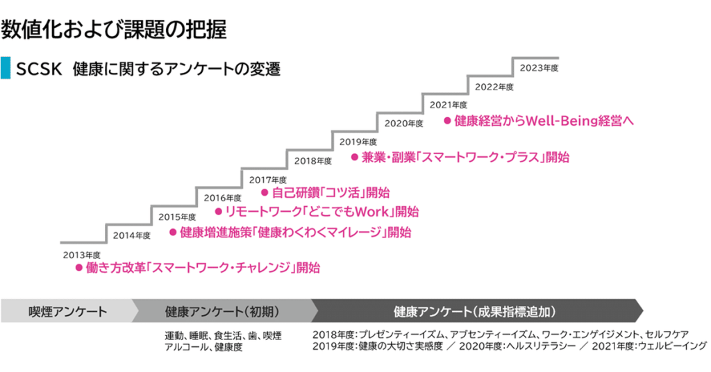 このような取り組みの過程において、経営トップは「働きやすい、やりがいのある会社を作ることが経営の軸」であるという認識のもと、健康経営を推進してきました。さらに、2021年度からは健康経営からWell-Being経営へと進化を遂げています。